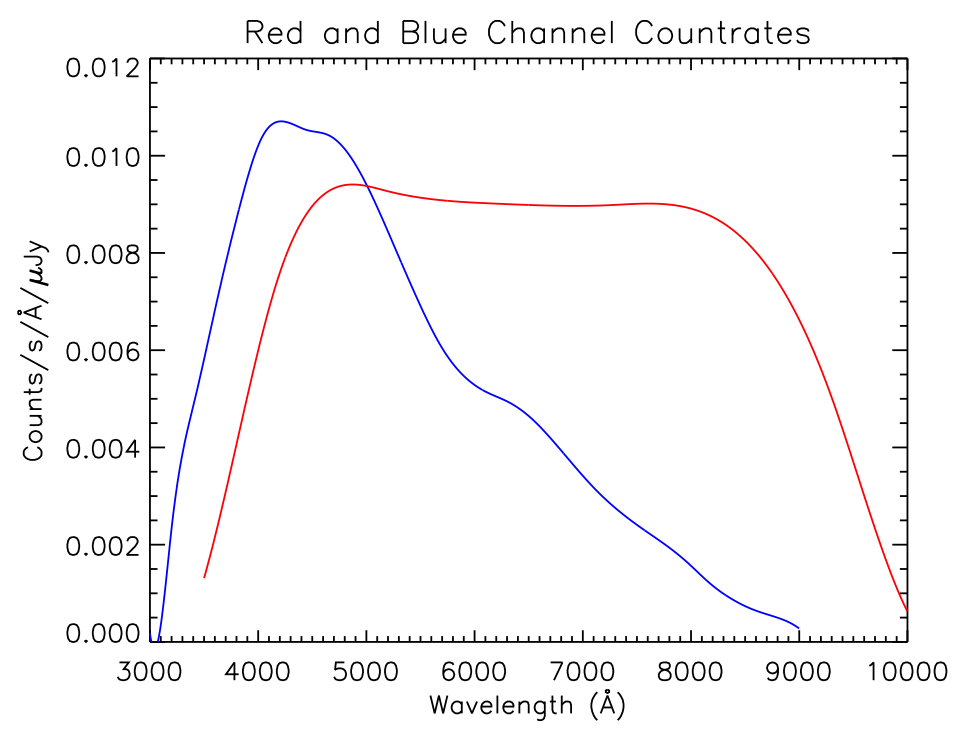 An illustration of the expected count rate (for a flat-spectrum (in F_nu) source of 1 micro-Jansky) per Angstrom is shown below.