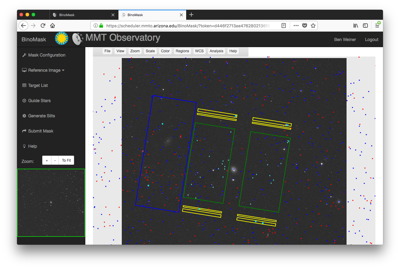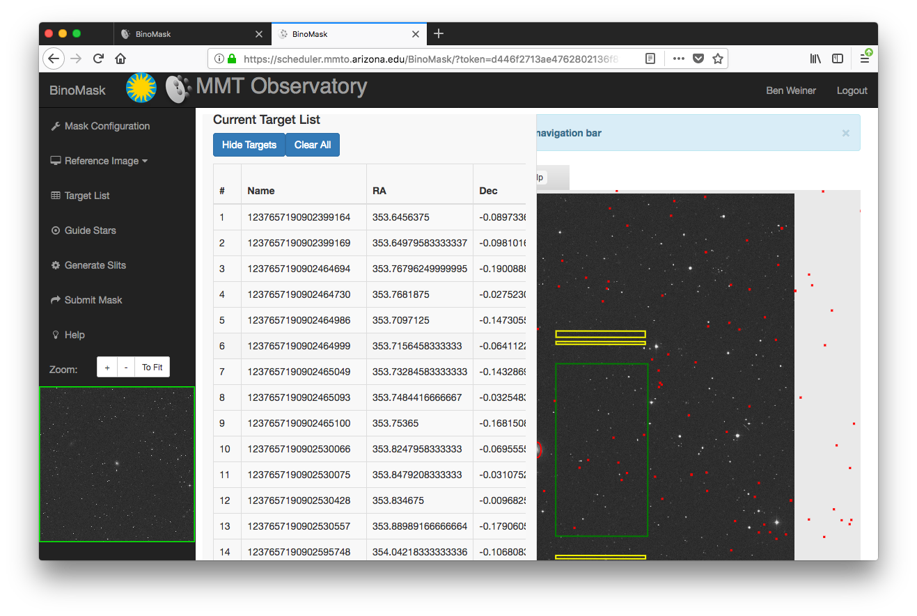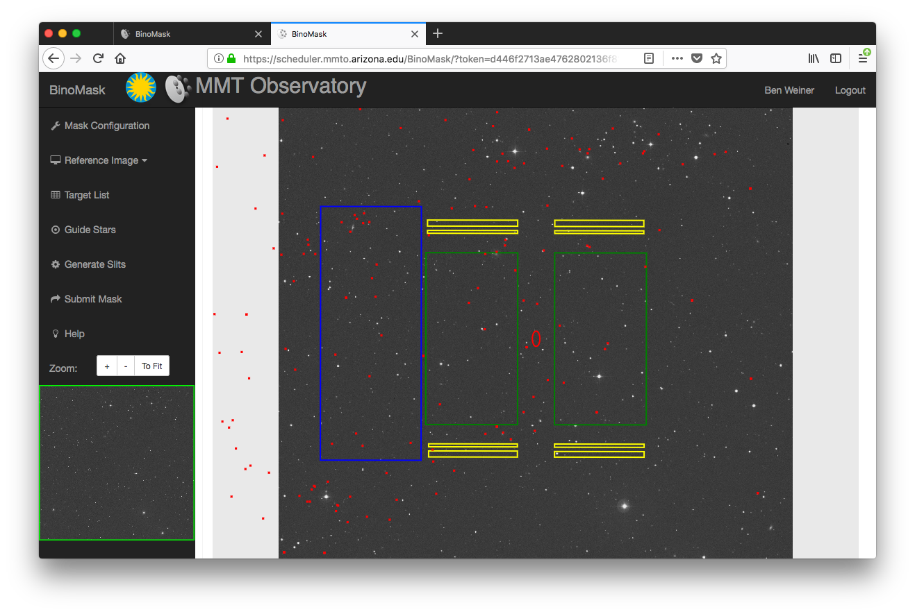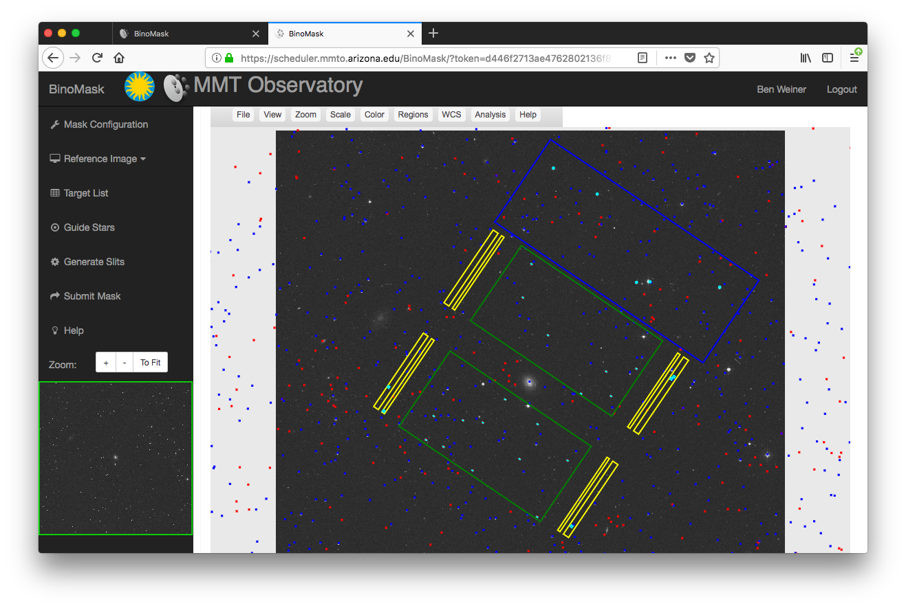 This page has a tutorial / walkthrough on using BinoMask. For now this is a walkthrough of a slitmask design, notes written by Ben Weiner, with screenshots of the process. We are updating this page as needed and will add a video walkthrough if needed. To access BinoMask for trial purposes, visit the URL scheduler.mmto.arizona.edu/BinoMask/.