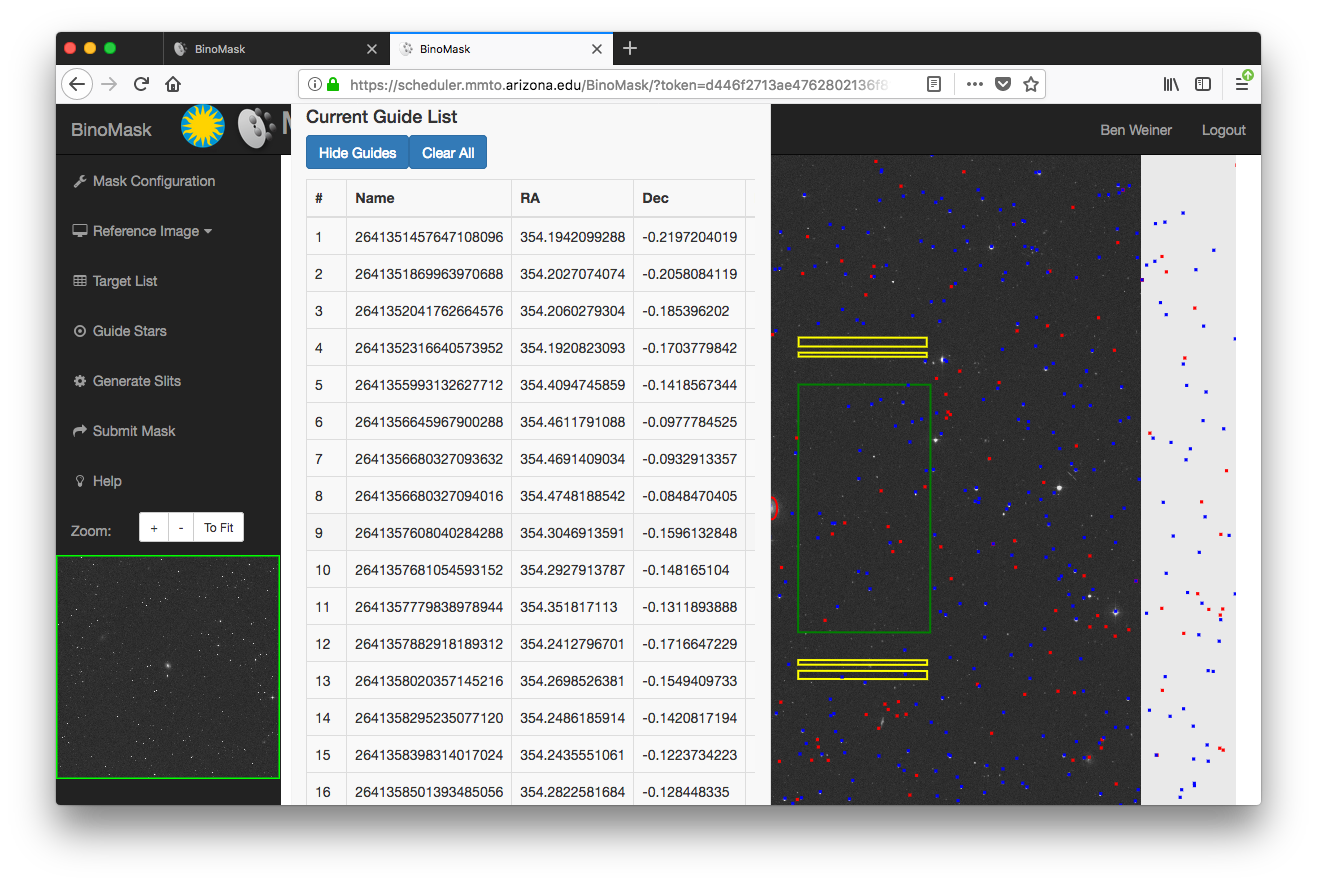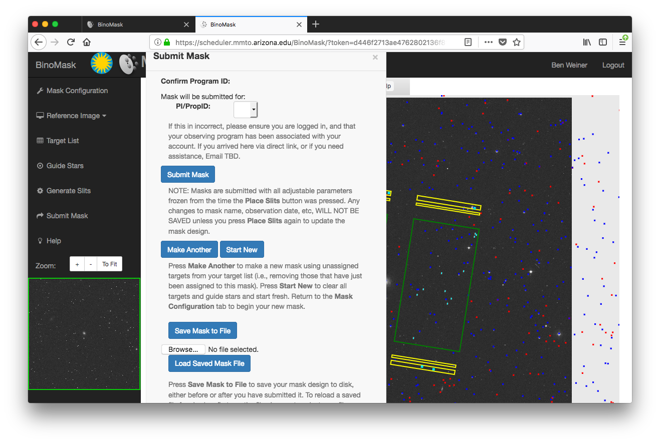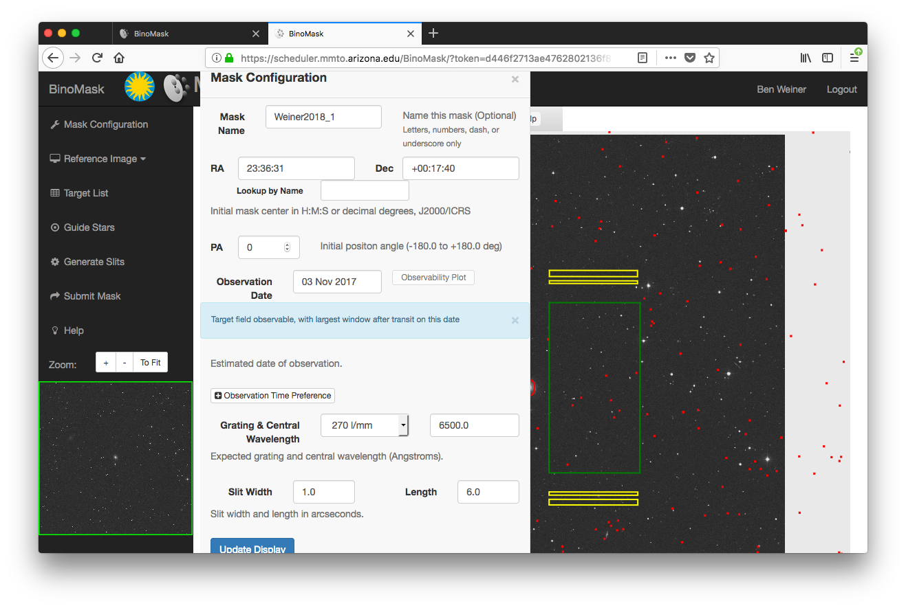 This page has a tutorial / walkthrough on using BinoMask. For now this is a walkthrough of a slitmask design, notes written by Ben Weiner, with screenshots of the process. We are updating this page as needed and will add a video walkthrough if needed. To access BinoMask for trial purposes, visit the URL scheduler.mmto.arizona.edu/BinoMask/.