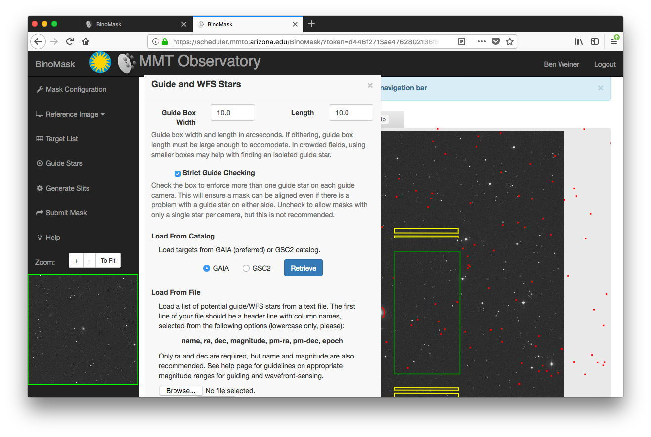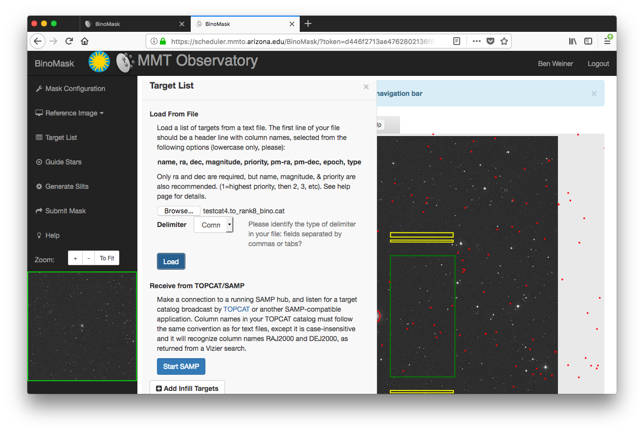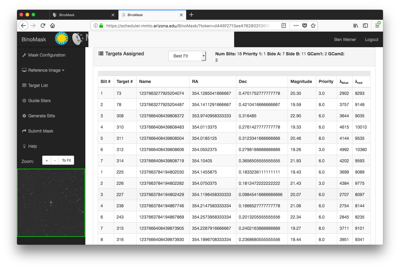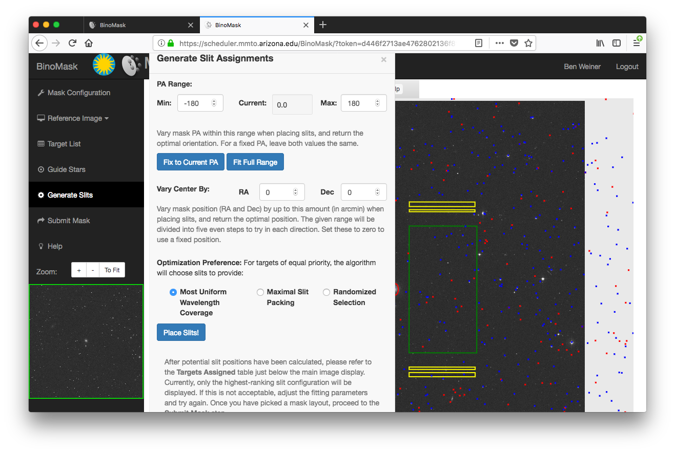 This page has a tutorial / walkthrough on using BinoMask. For now this is a walkthrough of a slitmask design, notes written by Ben Weiner, with screenshots of the process. We are updating this page as needed and will add a video walkthrough if needed. To access BinoMask for trial purposes, visit the URL scheduler.mmto.arizona.edu/BinoMask/.