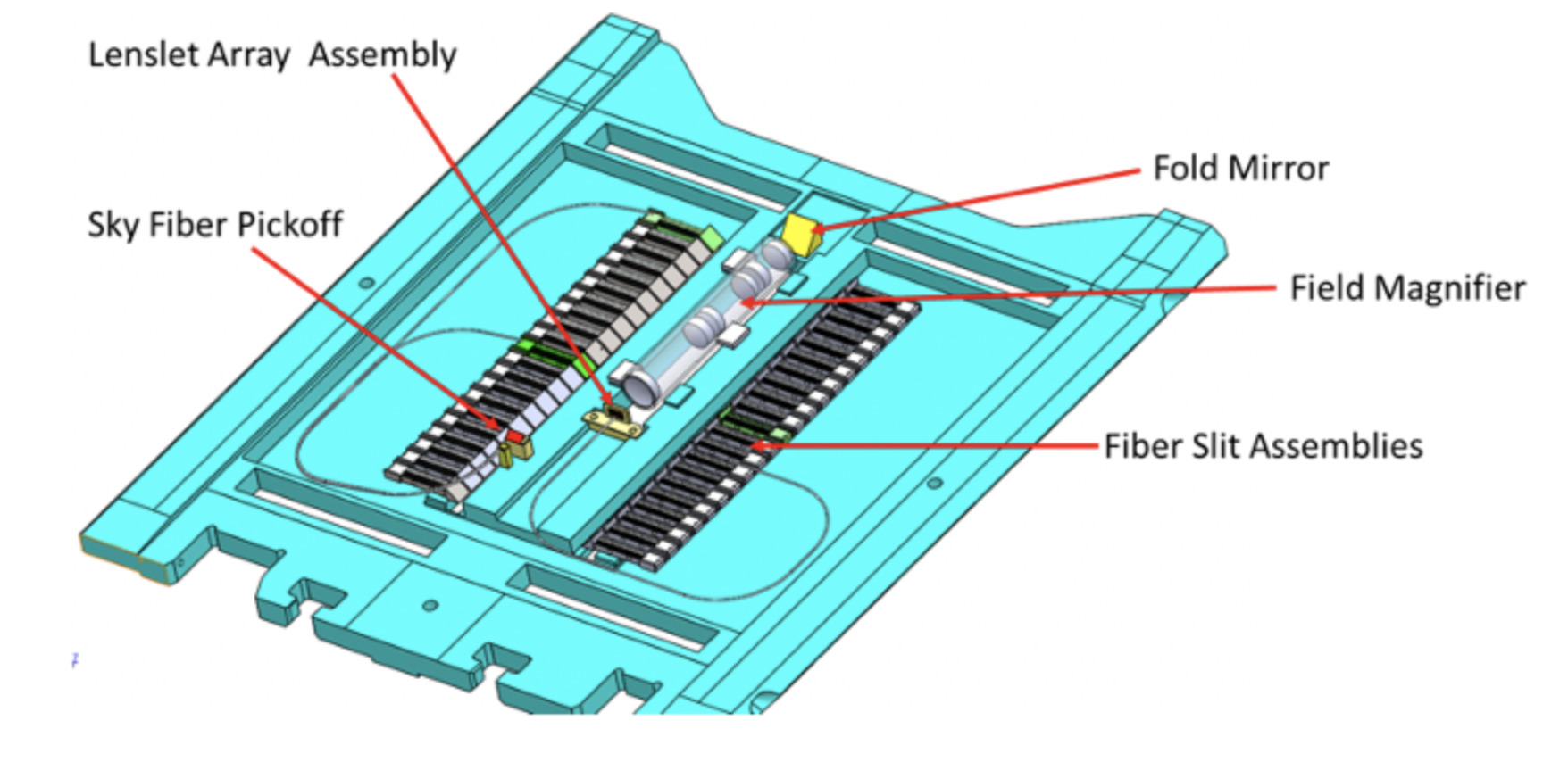 The IFU is built into a unit, shown above, that is inserted into the instrument like a slitmask, near the focal plane of the telescope. The cyan section is a modified slitmask frame. A pickoff mirror (yellow) redirects light from the science field into magnifying optics (gray), then into a lenslet array, and optical fibers, which remap the field into pseudo-longslits on the two spectrographs of Binospec. A second, smaller pickoff mirror samples a sky area roughly 8 arcminutes from the field. The light from the fibers enters the Binospec collimators and is dispersed and imaged onto the detectors as if from a longslit.