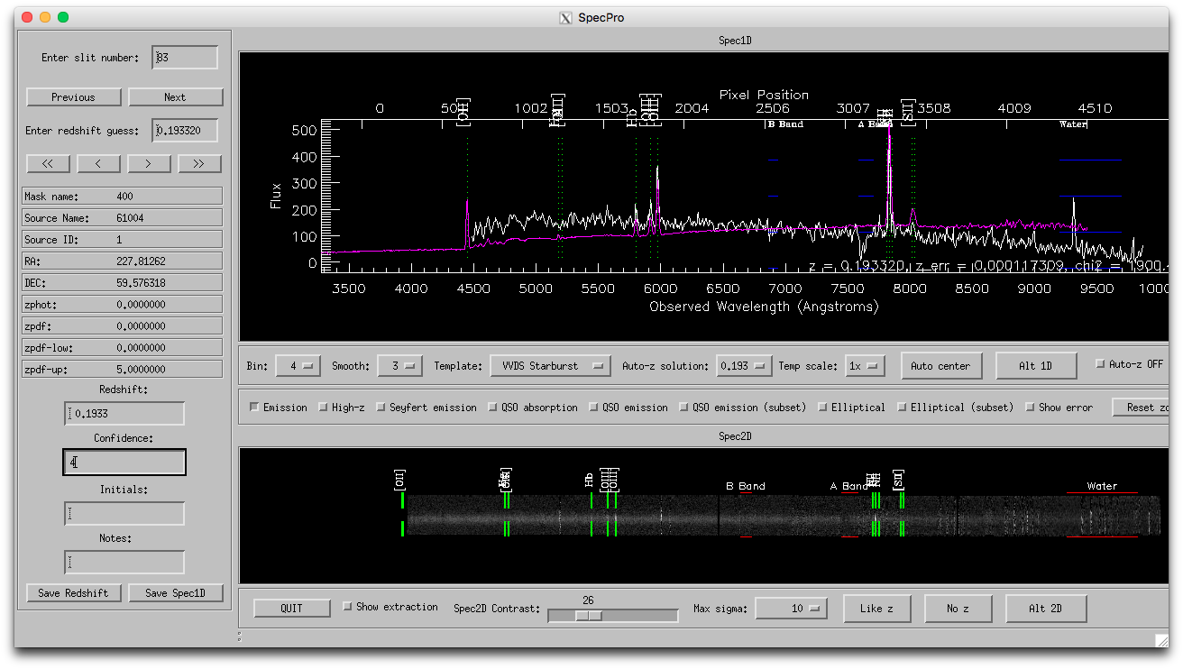Below the 1-d spectrum window, set bin=4, smooth=3. click “Emission” box to show location of common emission lines. You may also find “Elliptical (subset)” useful, and “QSO emission (subset)”, “High-z”, or “QSO absorption” useful depending on what types of objects are in your data.