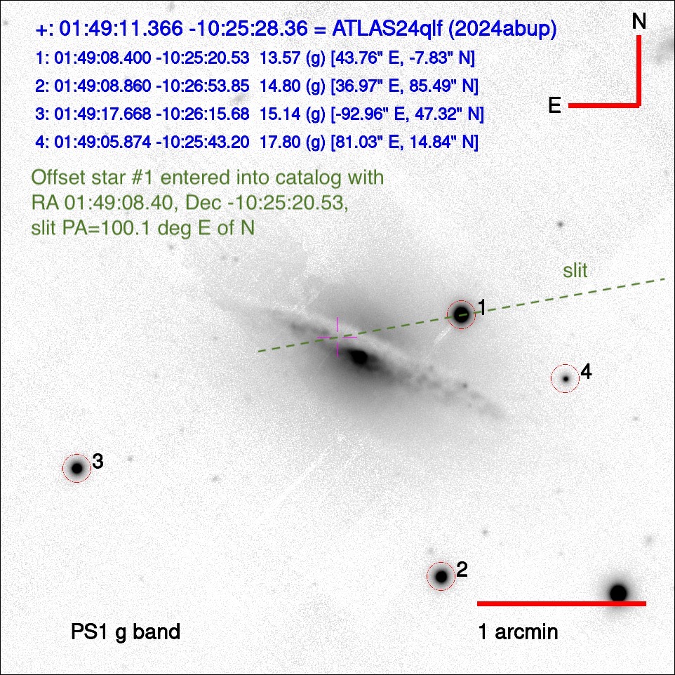 This chart for SN2024abup is not perfect since the target is not visible – it uses PanSTARRS-1 imagery that was taken before the SN went off. But it is good because there is a clearly visible, bright, well-isolated offset star, and a PA from the star to the target. The PI should create the catalog target with the RA, Dec of the SN, and the indicated slit PA. The RA, Dec of the star is then added using the “Add Offset Star” feature in the catalog dialog box. Although there is more than one star on the chart, you should only enter the offset star that corresponds to the correct PA. Also, the scale of the chart in arcmin is clearly marked and is well matched to the MMIRS imaging field of ~ 4 arcmin. (Credit: the chart image came from the Transient Name Server, with further text and slit PA added by MMT staff.)