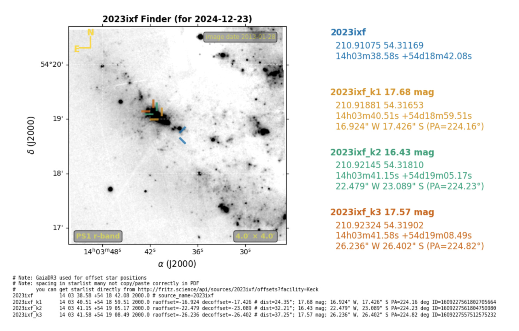 This finding chart will cause serious problems at the telescope, and the target will not be observable. This chart was generated by the ZTF survey automatically (I think) and illustrates some problems with finding charts that have not been carefully vetted by the PI. Problems include: (1) the PS1 imagery is pre-supernova and so the target is not visible in the chart; (2) the SN itself is old (2024 observing request for a 2023 SN) and so is faint, and the observers won’t be able to see it in a direct image. Ordinarily, the PI can compensate for this by entering an offset star and slit PA. However, in this chart, the chart-making script has automatically labeled 3 stars and their coordinates, but the stars (colored horiz/vert tickmarks) are crowded together in an overexposed part of the chart. The observer isn’t going to be able to find the offset star unambiguously by matching a direct image to the chart.