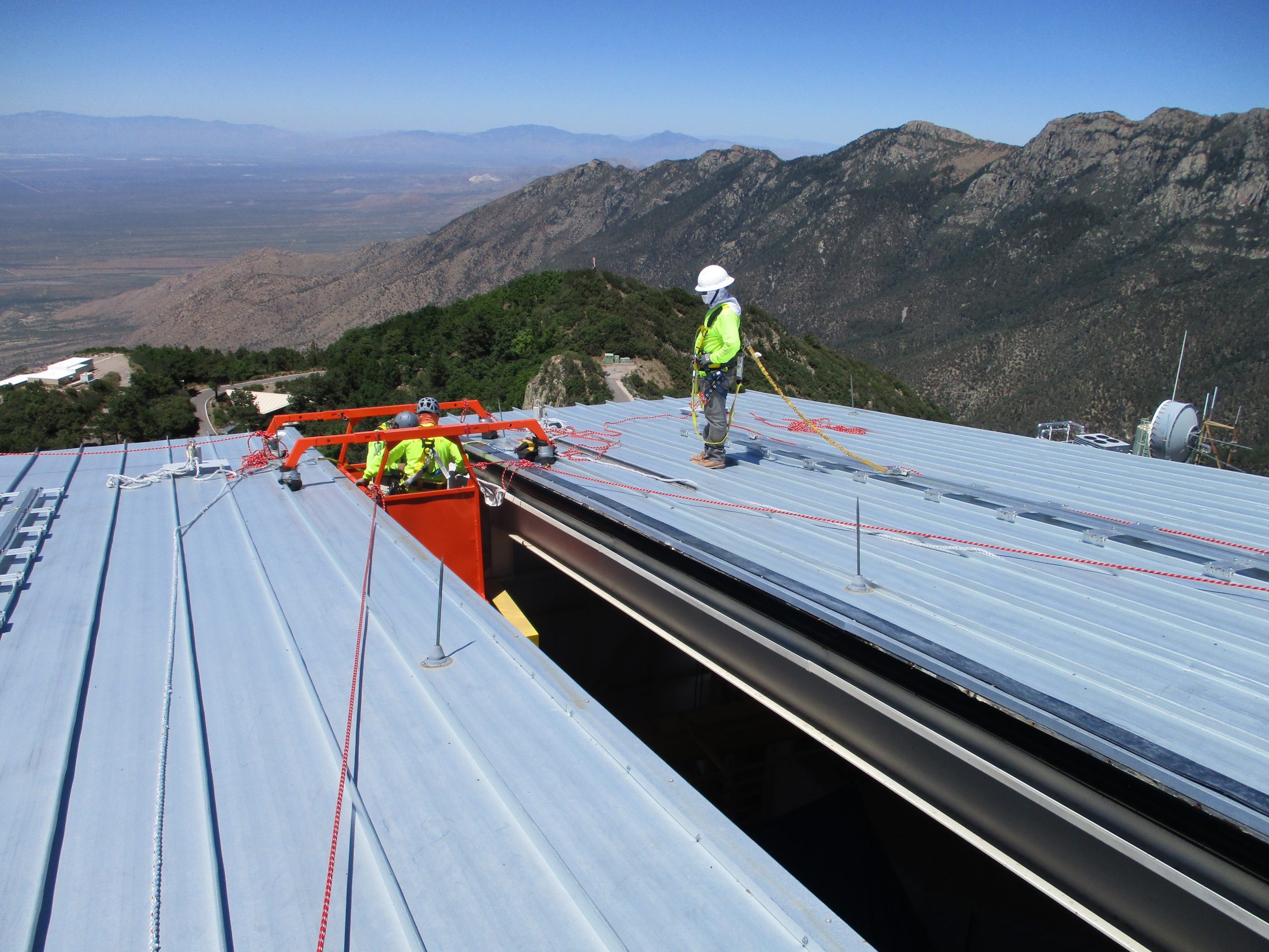 In preparation for the shutter seal replacement, the Blue Channel instrument and the f/9 secondary mirror were removed on June 18th and the telescope was parked horizon pointing and covered with a tarp. Kappcon, Inc. then began the process of replacing the EPDM material used to seal the two MMTO shutter halves when closed. The horizontal seal section was replaced using a custom access platform borrowed from the LBT Observatory (as seen in the image here). The vertical seal section was replaced using a rented boom lift. This work was completed on June 26th, and after completing other maintenance tasks, the telescope was returned to normal nighttime operation on June 30th.